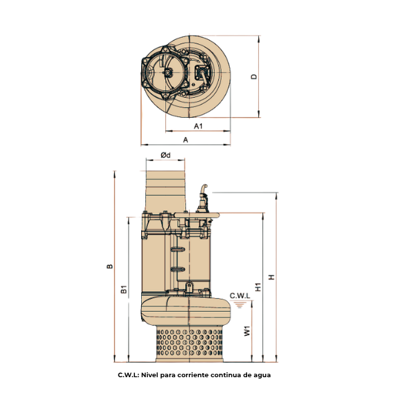 El diseño de flujo lateral y descarga superior proporciona refrigeración al motor incluso en caso de que la bomba funcione continuamente en condiciones semisumergidas.
